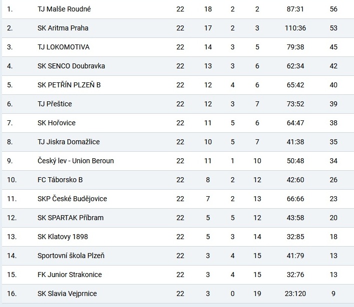 | 16. | FK Olympie Týn nad Vltavou | 15 | 16:41 | 9 |